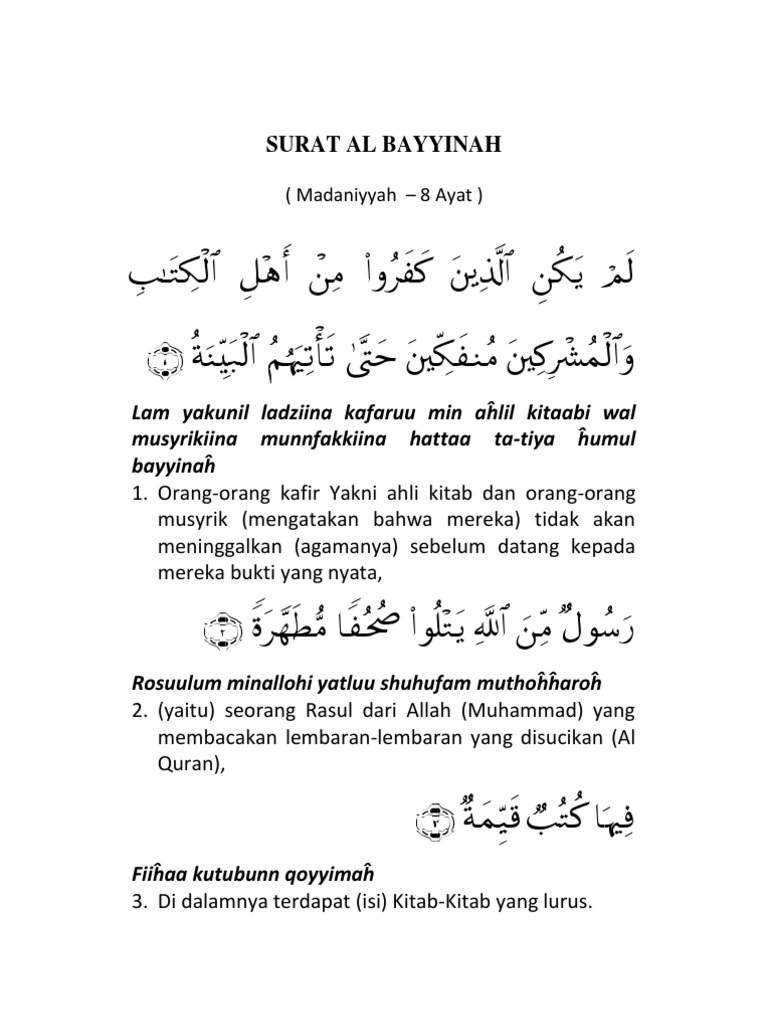 Salah satu ciri khas surat madaniyyah yaitu di dalamnya ada penyebutan tentang ahlul. Baca surat al bayyinah dan artinya. 8:07 banghen.com 290 087 просмотров. Penamaan surah ini diambil dari perkataan al bayyinah yang terdapat pada ayat pertama surat ini. Surah ini berisi tentang ancaman terhadap mereka yang menodai.